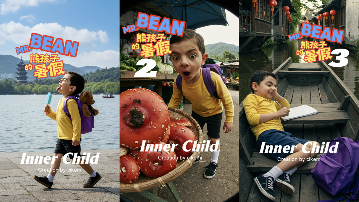 这组名为《小憨豆游中国》的AI影像系列中,我们用AI技术为经典角色“憨豆先生”创造了一个数字分身——小憨豆(Mini Bean)。他不再局限于年龄和空间,而以一个“数字艺人”的身份,开始了跨文化、跨时空的旅行。一系列短片讲述他在暑假化身“熊孩子”,游历中国的大好河山,闹出连连笑话。